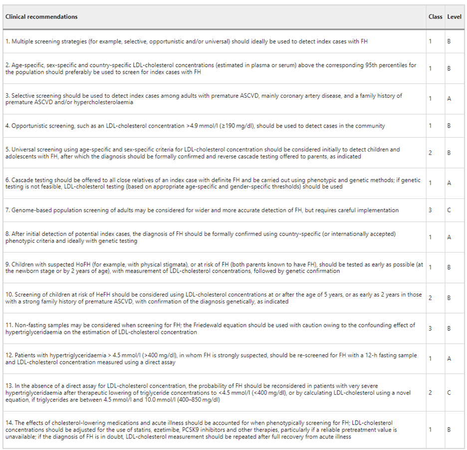 - “We recommend that cascade screening (lipid profile) protocols be implemented at the local, provincial, and national level in Canada and offered to first-degree relatives of patients with FH (Strong Recommendation, Moderate-Quality Evidence).”