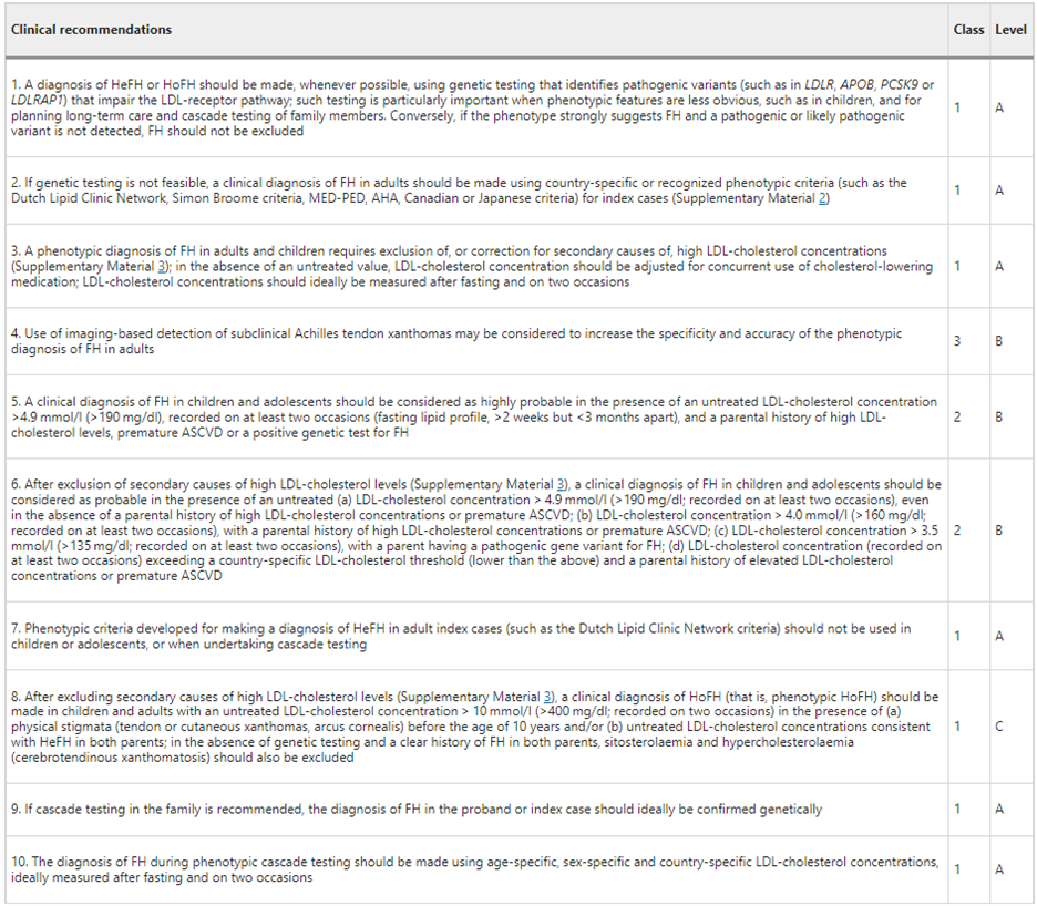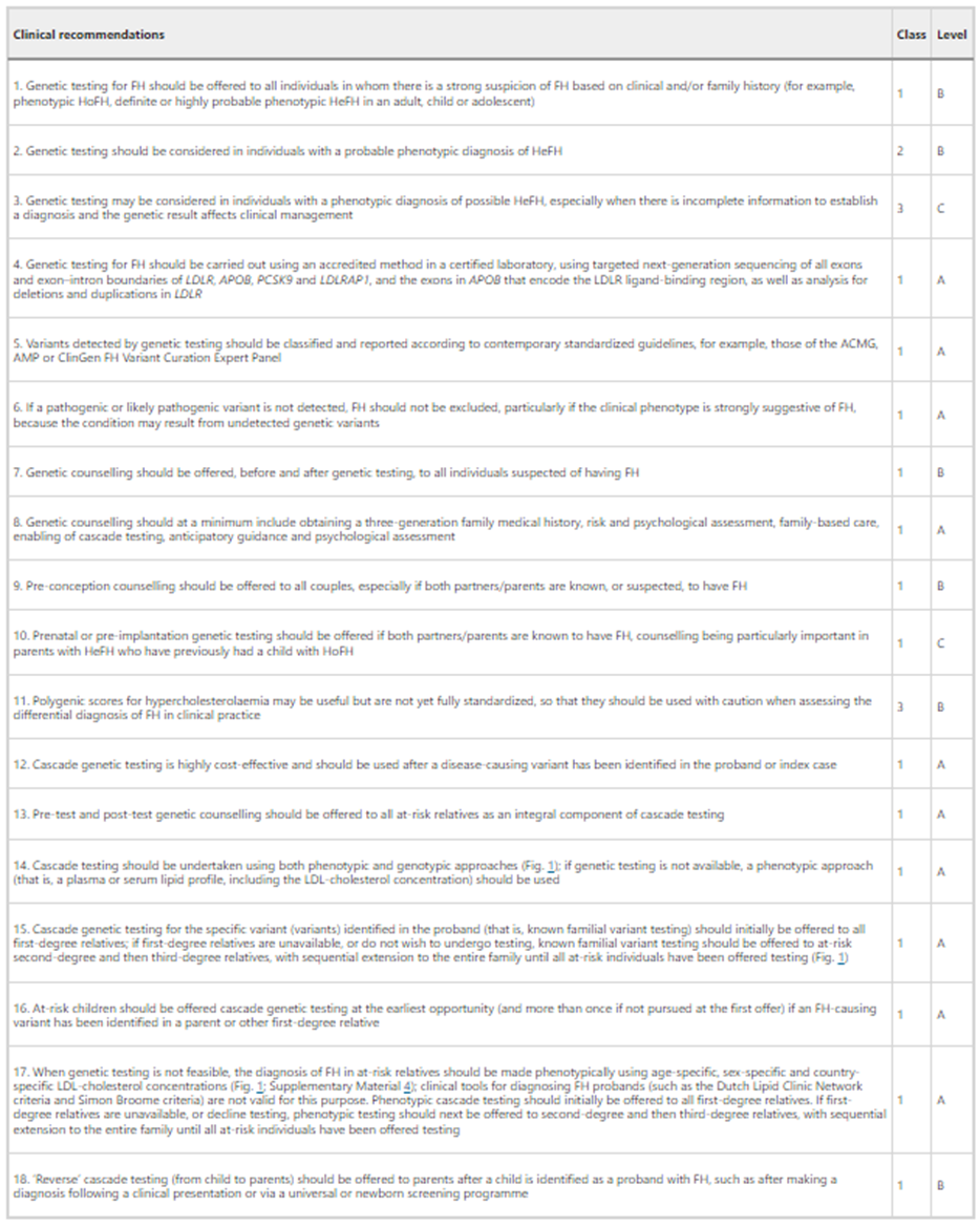 - “We recommend that genetic testing be offered, when available, to complement a diagnosis of FH and enable cascade screening (Strong Recommendation, High Quality Evidence). The decision to request genetic screening should be made by the treating physician after discussion with the patient.”