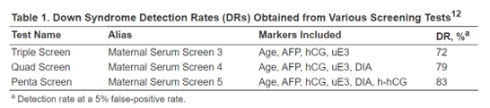 - Second-trimester (15 – 22 weeks) screening incorporating triple maternal serum markers (hCG, AFP, uE3 with NT) and quad maternal serum markers (hCG, AFP, uE3, DIA with NT).